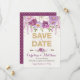 Gorgeous bohemian-inspired SAVE THE DATE card featuring rustic watercolor purple flowers with gold confetti accents