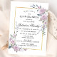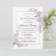 Soft blush purple roses and deep purple lilac flowers mingle with white freesia. They are nestled in a modern, open and airy green botanical arrangement. The purple and white flowers surround an elegant gold frame. An easy-to-use template lets you create a stunning invitation easily and quickly.