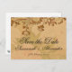 This beautiful wedding save the date post card has a gorgeous, boho floral pattern of faded peonies in harvest gold, with a decorative, shiny gold scrolling pattern of damask-like flowers and leaves along the top.