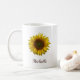 Boho botanical Yellow Sunflower bloom coffee mug, with customizable script typography. Enjoy this personalized accessory item for everyday use or as a gift for someone special.