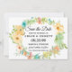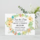 Very pretty watercolor flowers create colourful Save the Date card. A large wreath on the front frames the wedding info. An elegant sprig decorates the back which is soft green. Wildflowers are soft yellow, bright turquoise blue, and pretty peach pink. All kinds of leaves and dangles give it its Boho vibe. You can easily change all of the text. This item is part of the Rustic Boho Wildflowers collection. You should see a link to it on this page. If you don't please contact me.