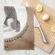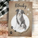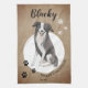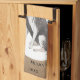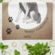 Rustic Border Collie Drawing Paw Merry Christmas kitchen towel. Fun and cute border collie drawing. The background is rustic beige with white snowflakes and black paw prints. Personalise the towel with name and year. A lovely holiday keepsake for a border collie owner.