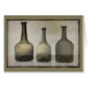 Rustic, still life art with 3 antique bottles in muted tones of green and brown.