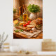 A rustic still life featuring fresh bread, olive oil, herbs, and warm textures. Inspired by Mediterranean cuisine, this artwork adds natural warmth and authenticity to kitchens, dining areas, or restaurant interiors.