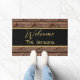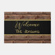 Faux distressed rustic wood repeated pattern personalised Welcome Family Name door mat.