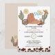 Modern in style cowboy themed baby shower invitation featuring a retro style heading, wild west scene and cow print pattern. This a little cowboy is on the way baby shower invitation is ideal for a western themed boys baby shower.