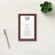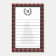 Rustic red and black buffalo check plaid notepad with monogram letter framed by black laurels. The lined area features a forest tree silhouette watermark.