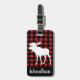 Rustic buffalo check plaid in red and black with a white moose silhouette luggage tag with personalised name in script.