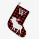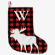 Rustic buffalo check plaid Christmas stocking with a crisp white moose silhouette and monogram letter.