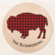 Rustic cabin themed pulp board paper coasters done in a craft paper look with graphics of a red and black plaid buffalo silhouette. Personalise the black arched text to suit your needs.