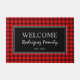 Rustic buffalo plaid Welcome script, family name year established Doormat