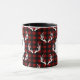 Rustic holiday mug featuring white deer a antlers pattern. The background is a red and black buffalo check plaid that's perfect for a rustic Christmas! Cosy up with your favourite hot chocolate or coffee this holiday season in bold rustic wilderness style!