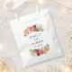 A rich, romantic wedding favour bag featuring a lush watercolor floral arrangement in deep burgundy, warm blush, and soft peach tones with greenery accents. The couple's monogram names and wedding date are displayed in elegant script and serif typography at the centre. All text is fully customisable. Beautiful for fall or winter reception treat tables, candy bars, or guest favours.