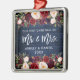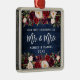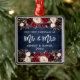 Rustic Blue Wood, Modern Brush Script, Watercolor Burgundy Floral, Our First Christmas as Mr. and Mrs. Heart Wedding Ornament