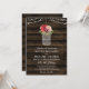 Rustic wedding invitation with a mason jar with burgundy and marsala coloured flowers, hanging from string lights on a dark barn wood background.