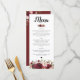 Elegant floral wedding menu cards featuring a classic white background on the front, an array of marsala red, burgundy & blush pink watercolor floral flowers, and a menu option template.====================================================================================