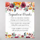 Wedding poster sign displays signature cocktail drinks for the wedding reception. Design features a border of rustic summer and fall floral watercolor designs with beautiful roses, dahlias, peony flowers, and greenery, in a gorgeous autumn palette of burgundy red, golden yellow, peach orange, blush pink, and shades of green. Stylish text can be fully personalised with three signature wedding cocktails.