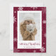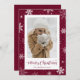 Custom burgundy burlap photo Christmas cards featuring snowflakes on a snowy burgundy red burlap background. Easily personalise these rustic snowflake photo Christmas cards with your photo and family name.