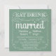 Eat, Drink, and be Married -- Vintage style rustic country wedding invitations -- Swirly, curly scrolls and old-fashion typography on sage mint green burlap background. Add your names and wedding info in this easy to use template. Elegant but fun and whimsical, chalkboard style script writing can be modified for your formal or semi-formal retro wedding theme. Casual modern style is perfect for trendy contemporary weddings with a fun touch of sophisticated charm for the traditional bride and groom. Please contact us for help with customisation if you need additional room for your wedding details. Other sizes and chalkboard styles available. NOTE: This product design is set-up for square cards only -- requires extra postage.