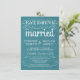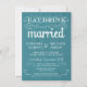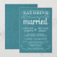 Eat, Drink, and be Married -- Vintage style rustic country wedding invitations -- Swirly, curly scrolls and old-fashion typography on tropical turquoise teal ocean blue burlap background. Add your names and wedding info in this easy to use template. Elegant but fun and whimsical, chalkboard style script writing can be modified for your formal or semi-formal retro wedding theme. Casual modern style is perfect for trendy contemporary weddings with a fun touch of sophisticated charm for the traditional bride and groom. Please contact us for help with customisation if you need additional room for your wedding details. Other sizes and chalkboard styles available.