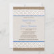 The design features a lovely rustic burlap effect background with a romantic vintage white lace and blue ribbon effect trim.