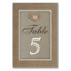 This table number card features a burlap look background which almost appears like a frame around the primary part of the design. A lighter burlap is used inside the "frame" where a heart appears with your monogrammed initials on it. The word table appears below, as does a number which you can customise. This is a very unique look burlap wedding table number card. Copyright henishouseofpaper