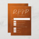 Follow the autumn trend of earthy tones with our burnt orange to brown gradient fall wedding vertical RSVP card. Simple white typography on a rustic background for a minimalist look. Bohemian hues reminiscent of terracotta clay highlight your entree selection on this trendy colour fade card with meal choices.