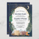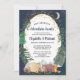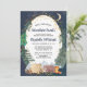 Rustic couples baby shower invitation featuring a cute illustration of woodland animals with their tent camping in the mountains and forest, an overlay of gold stars and moon in a nighttime sky, "Our Greatest Adventure Awaits" and the names of the mother and father in a dark midnight blue script.