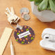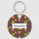 A keychain with a fun camping themed pattern. Set on a reddish brown background. Elements in the pattern include a campfire, a tent,. a guitar, a shovel and backpack.