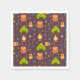 Paper napkins with a fun camping themed pattern. Set on a reddish brown background. Elements in the pattern include a campfire, a tent,. a guitar, a shovel and backpack.