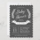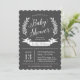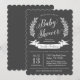Chic rustic baby shower invitation with elegant typography in a white botanical wreath. Design has a printed faux chalkboard background. Click Customise It to change text fonts and colours to create a unique one of a kind design.