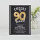 Celebrating turning 90! These 90th birthday party invites are designed with the title 'Cheers to 90 Years!'. Featuring a rustic chalkboard background, gold number ninety helium balloons, trendy white typography and a simple birthday party template that is easy to customise.