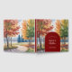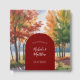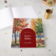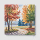 A watercolor painting of an autumn landscape with a dirt path winding through colourful trees. The trees on the left have deep red and orange leaves, while the trees on the right transition from yellow to green. A tall blue pine tree stands in the middle distance. The path is painted in warm brown tones with fallen orange leaves scattered along it. The background features rolling hills in muted blue and purple tones. The sky is painted in soft blue and white washes, creating a peaceful autumn atmosphere. The grass along the path is rendered in various shades of green and gold. The painting has a loose, expressive style typical of watercolor techniques, with visible brush strokes and colour bleeding. The composition is balanced with the trees creating strong diagonal lines leading from the foreground to the background. The overall colour palette consists of reds, oranges, yellows, greens, blues, and browns, capturing the essence of a fall day.