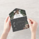 ALSO AVAILABLE WITH A QR CODE TO SCAN. This design features a rustic green pine and pinecone bouquet on a soft charcoal background with white flowers. It is accented with a white sparkle overlay to illustrate the magic of the beautiful winter holidays. Perfect for a Christmas or winter wedding. Personalised All-In-One invitations are a unique combination of both a beautifully printed custom invitation with an easy to tear off perforated RSVP postcard. And they are so easy to use! You simply fold, then seal the back flap with the three included clear stickers, and mail. And when your guests receive your custom invite, they just tear the perforated RSVP Card off and drop it back in the mail to you!