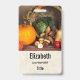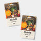 Personalised name badge with a photograph of a thanksgiving harvest, set on a rustic wooden table. Pumpkin, potatoes, squash etc... make up this bountiful collection of food. Colourful autumn leaves surround the cornucopia basket.