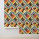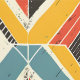 This artwork presents a dynamic and textured pattern of chevron and triangular shapes arranged in a bold mosaic. The design features a vibrant yet earthy colour palette of teal, mustard yellow, red, and black, set against a cream background. The pattern is distressed with subtle scratches and rough textures, giving it a rustic, worn-in appearance. The geometric arrangement creates a sense of movement and depth, while the bold lines and contrasting colours evoke a sense of energy and vitality, reminiscent of vintage textiles and handcrafted designs.