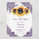 Rustic purple and yellow sunflower wedding save the date card featuring sunflowers, string lights and purple floral lace. Burlap hearts and floral lace at the back. Matching items available to complement this purple floral wedding save the date card.