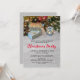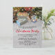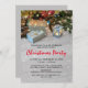 Rustic xmas holiday party invitations featuring a wood background, christmas gifts, lantern, foliage, decorations, snow, and a festive celebration template that is easy to personalise.