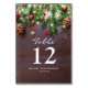 Rustic winter christmas party table number cards featuring a dark wooden background, festive christmas tree branches, red & gold tree decorations and string twinkle lights.