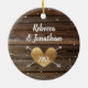 Create your own ornaments this holiday season! These round rustic wood gold Christmas photo ornaments can be uniquely yours by inserting your own photo, and changing the personalised text on the back. The design features a beautiful dark brown rustic wood background with a distressed gold circular border and falling snowflakes on the front. On the reverse side of these round custom ceramic ornaments is a handwritten script text area for your names and year, along with a rustic gold heart with white crossed arrows. Category: round photo ornaments; rustic photo ornaments; and picture ornaments. Colours: dark brown wood, gold and white.