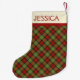 Personalised stocking with a rustic Christmas plaid pattern in moss green and red, with gold accents. Designed to hang facing either direction. Available in two sizes and three fabric types.