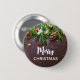Button with a rustic photograph of a brown wooden table with pinecones, pine needles, snow, and Christmas ornaments. Festive and lovely.