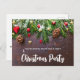 Christmas invitation postcard with a rustic photograph of a brown wooden table with pinecones, pine needles, snow, and Christmas ornaments. Festive and lovely.