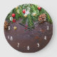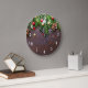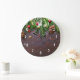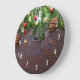 A clock with a rustic photograph of a brown wooden table with pinecones, pine needles, snow, and Christmas ornaments. Festive and lovely.