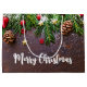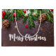 A gift bag with a rustic photograph of a brown wooden table with pinecones, pine needles, snow, and Christmas ornaments. Festive and lovely.
