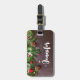 A luggage tag with a rustic photograph of a brown wooden table with pinecones, pine needles, snow, and Christmas ornaments. Festive and lovely.