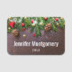Name tag with a rustic photograph of a brown wooden table with pinecones, pine needles, snow, and Christmas ornaments. Festive and lovely.