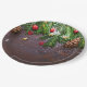 Paper plates with a rustic photograph of a brown wooden table with pinecones, pine needles, snow, and Christmas ornaments. Festive and lovely.