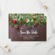 Save the date card with a rustic photograph of a brown wooden table with pinecones, pine needles, snow, and Christmas ornaments. Festive and lovely.