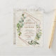 Modern and trendy, this postcard wedding invitation design features a faux copper geometric embellished with watercolor eucalyptus greenery, over a faux white birch bark texture. The couple's names and some wedding details are in a matching copper colour, and the back of the postcard features a stand of birch trees. Copyright Elegant Invites. All rights reserved.